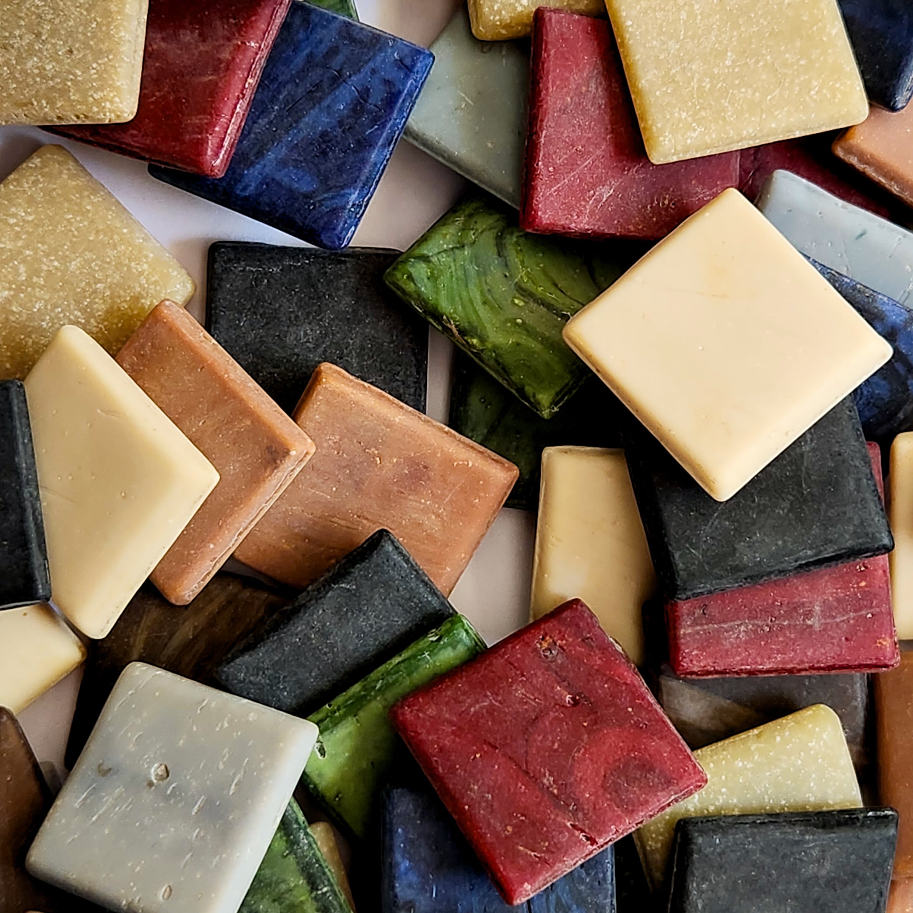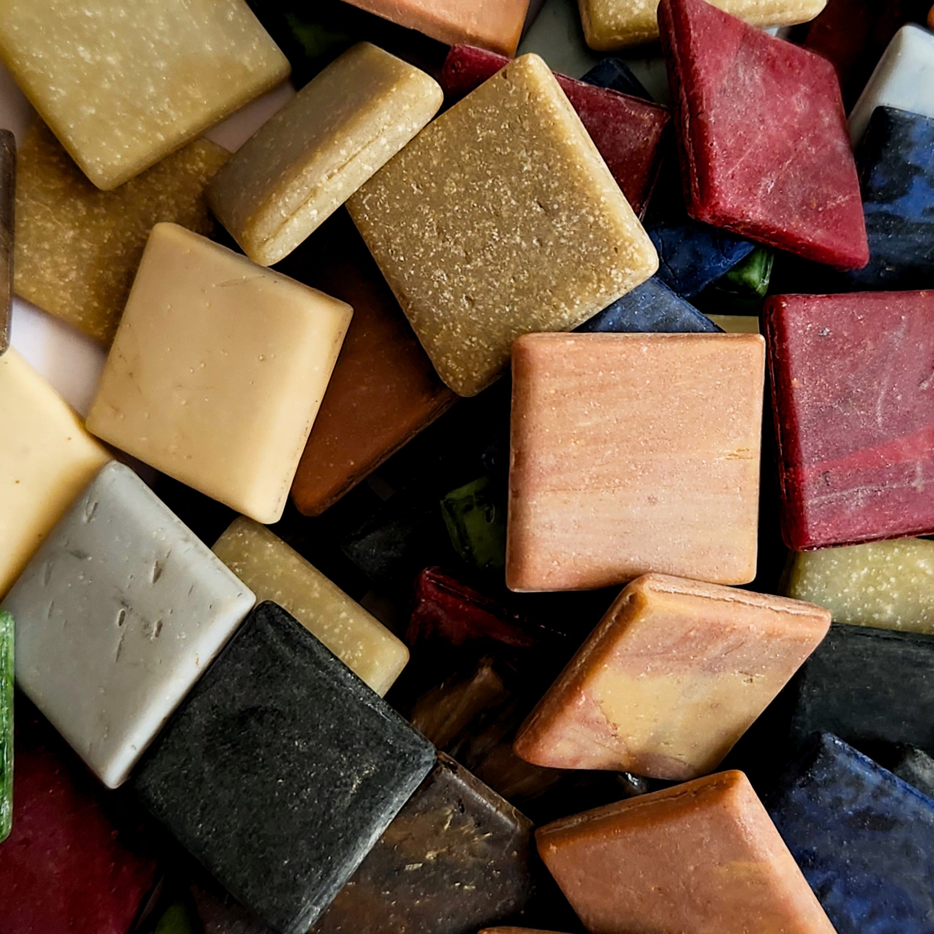 Zenza glass tiles have a tumbled matte finish which looks and feels like marble or granite. As they are a similar thickness to smalti, they can be used interchangeably. The tiles are 2.4cm square, and there are16 pieces in 100gms. A kilo of zenza tiles will cover a 30x30cm area. The cut edge is shiny and can be used to contrast the matte finish.
